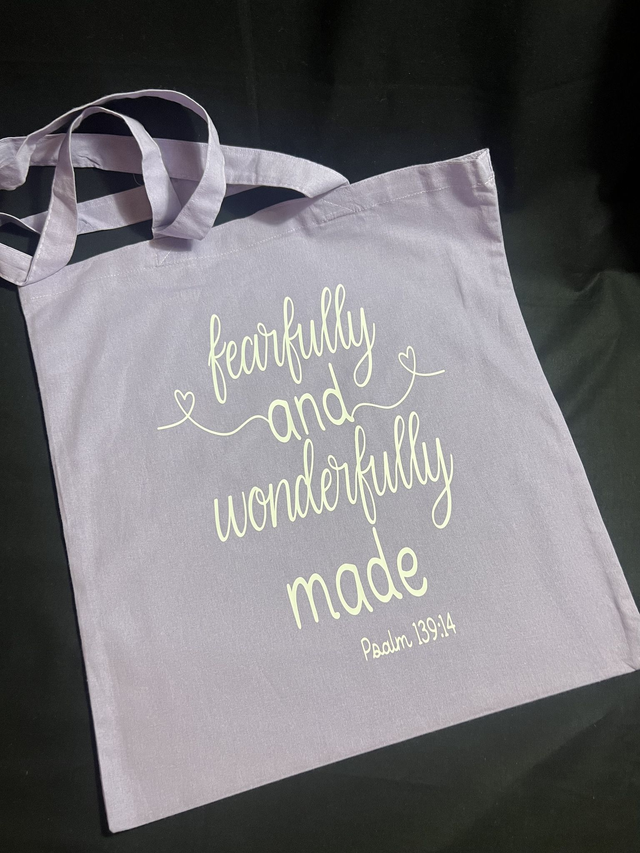 This reusable tote bag is the perfect accessory for any Christian who wants to spread encouragement throughout their everyday life. Adorned with Psalm 139:14, "I am fearfully and wonderfully made," this bag serves as a beautiful reminder of our inherent worth and value. Use it as a grocery bag, trendy purse, or carry-all for work or school. The sturdy construction ensures durability for all your daily needs. Make a statement with this uplifting and stylish tote bag.