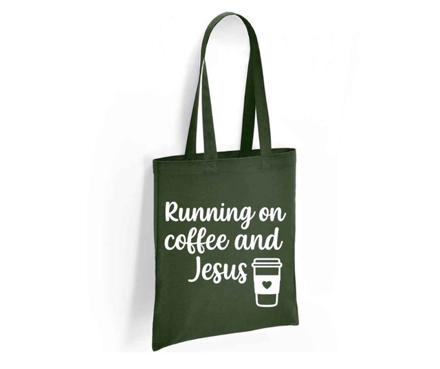 Shop our environmentally friendly and sustainable "Running on Coffee and Jesus Tote Bag"! Made from 100% cotton, this spacious 10 litre capacity shopper is perfect for the eco-conscious coffee lover with a Christian style. Show off your Christian faith while reducing waste with this reusable and durable tote. Available in a variety of colors including Mustard, Charcoal, Forest Green, Burgundy, Denim Blue, Turquoise, and Pink, this versatile tote is perfect for grocery shopping, beach trips, or carrying your daily essentials. Embrace your religious beliefs while being stylish and practical!
